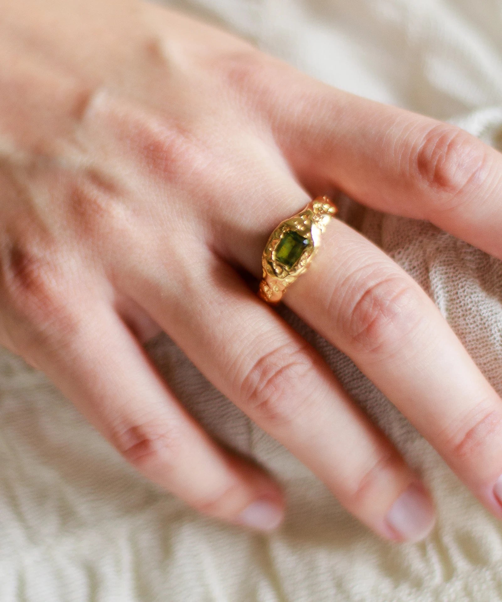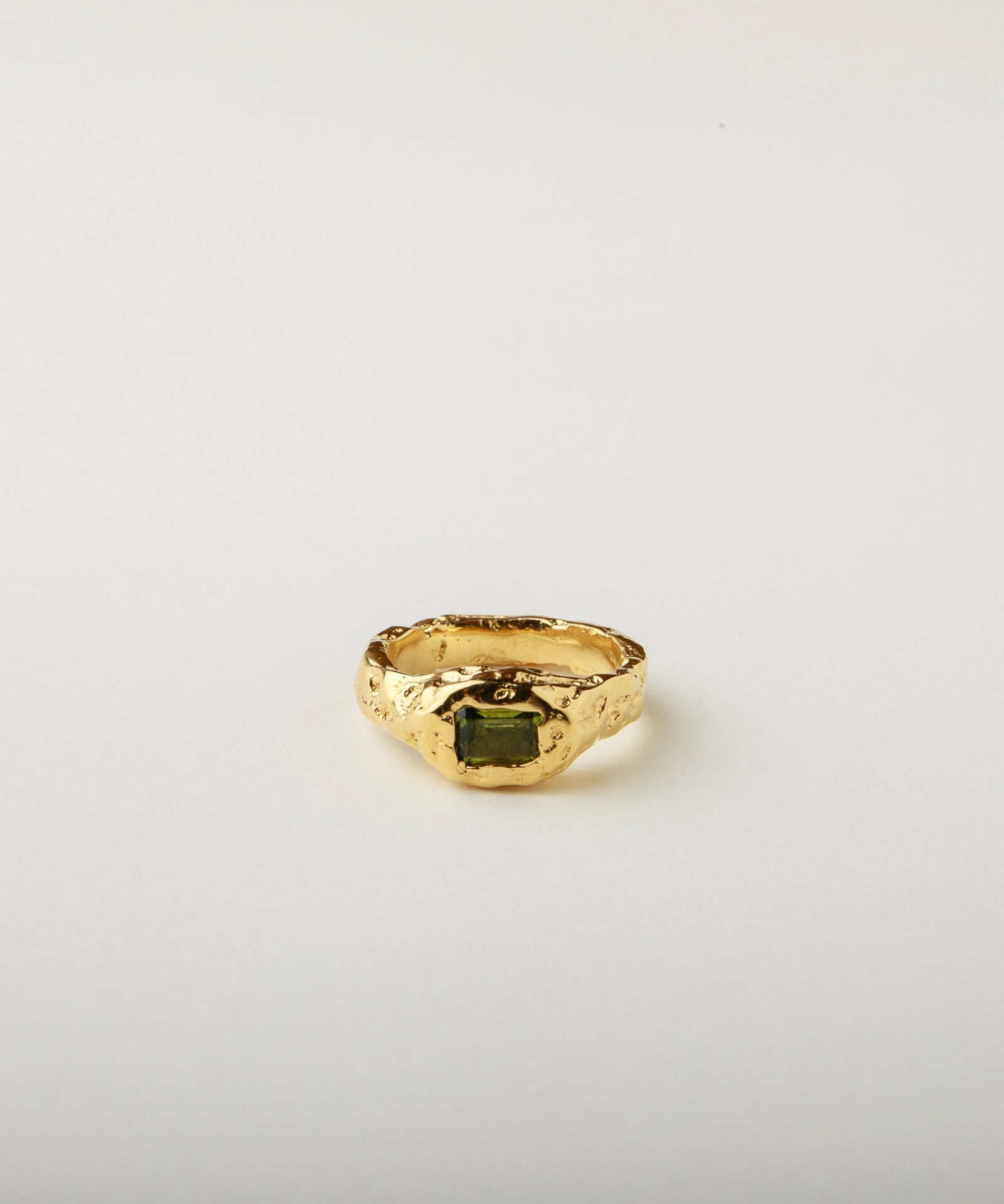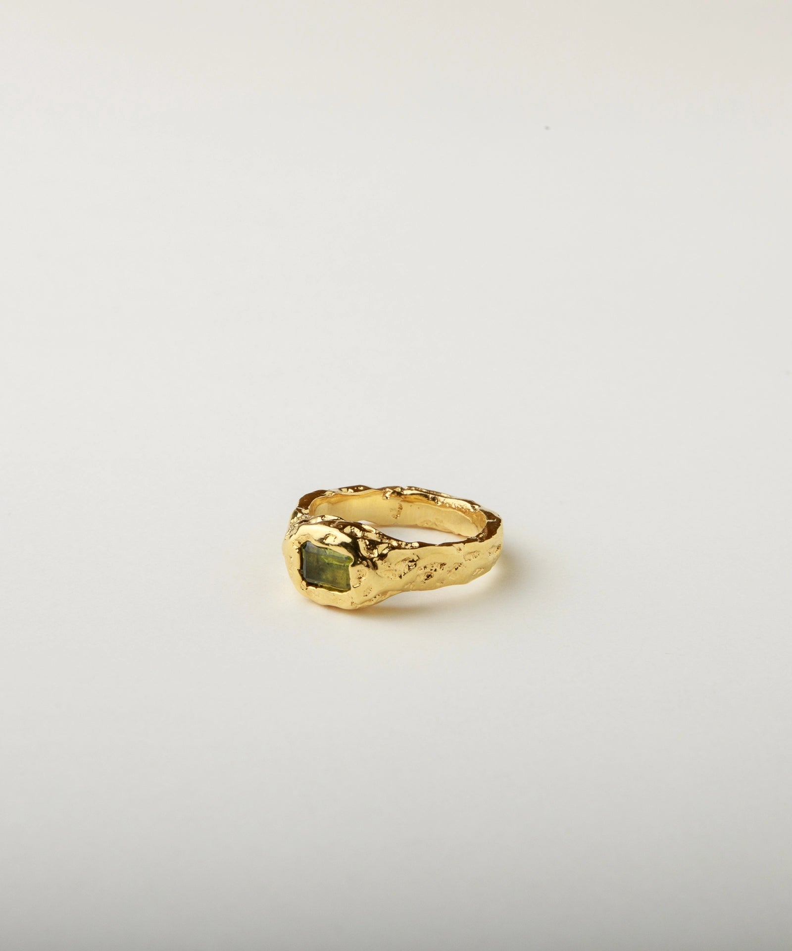 La base está hecha en latón chapado en oro de 18 quilates, lo que le otorga un brillo cálido y lujoso. En el centro, destaca una piedra de corte rectangular en un intenso tono verde oliva. Esta gema resalta armoniosamente sobre el acabado dorado, aportando una nota vibrante y sofisticada al conjunto.